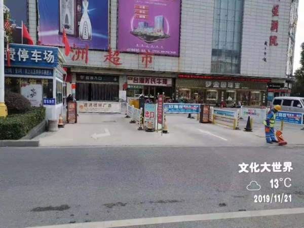 文化大世界缺口施划导向箭头,沿泗州大街由西向东车辆可以右转驶入文化大世界停车场,按照箭头导向右转驶出文化大世界停车场;泗州大街道路中心线是黄实线,禁止泗州大街由东向西车辆越黄实线左转驶入文化大世界停车场,禁止文化大世界停车场车辆越黄实线左转驶入泗州大街。