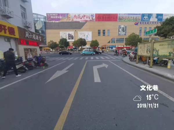 泗州大街文化巷路口处道路中心线为一实一虚的双黄线,沿泗州大街由东向西车辆在确保安全情况下可在黄色虚线处左转驶入文化巷,禁止车辆从文化巷左转驶入泗州大街。