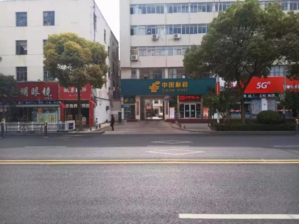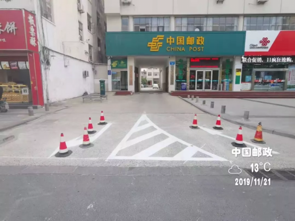 邮政局缺口处施划白色导流岛和导向箭头,车辆可以按照箭头导向右转驶入邮政局,右转驶出邮政局;泗州大街道路中心线是黄实线,禁止泗州大街由东向西车辆越黄实线左转驶入邮政局,禁止邮政局车辆越黄实线左转驶入泗州大街。