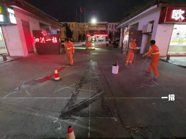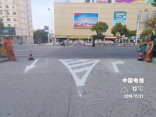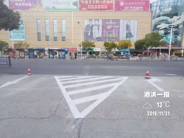 一招门前缺口处施划白色导流岛和导向箭头,车辆可以按照箭头导向右转驶入一招,右转驶出一招;泗州大街道路中心线是黄实线,禁止泗州大街由东向西车辆越黄实线左转驶入一招,禁止一招车辆越黄实线左转驶入泗州大街。