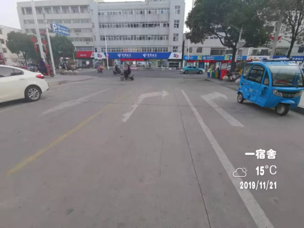 泗州大街一宿舍路口处道路中心线为一实一虚的双黄线,沿泗州大街由西向东车辆在确保安全情况下可在黄色虚线处左转驶入一宿舍道路,禁止车辆从一宿舍道路左转驶入泗州大街。