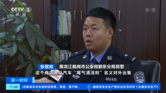 鹤岗市公安局鹤东分局民警 张现旭:这个商店是以汽车“尾气清洁剂”名义对外出售,他向我们介绍宣传时候,主要卖点是能够代替92号、95号汽油去使用,每升大概比市面上正规汽油便宜1块5左右。