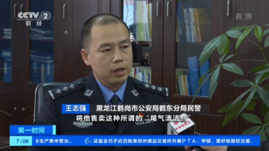 鹤岗市公安局鹤东分局民警 王志强:我们通过秘密侦查、提取,将他售卖这种所谓的“尾气清洁剂”,送到了我们鹤岗市质量技术监督局检测中心进行了检验。检验显示它的各项数值和92号汽油的数值是相符的。