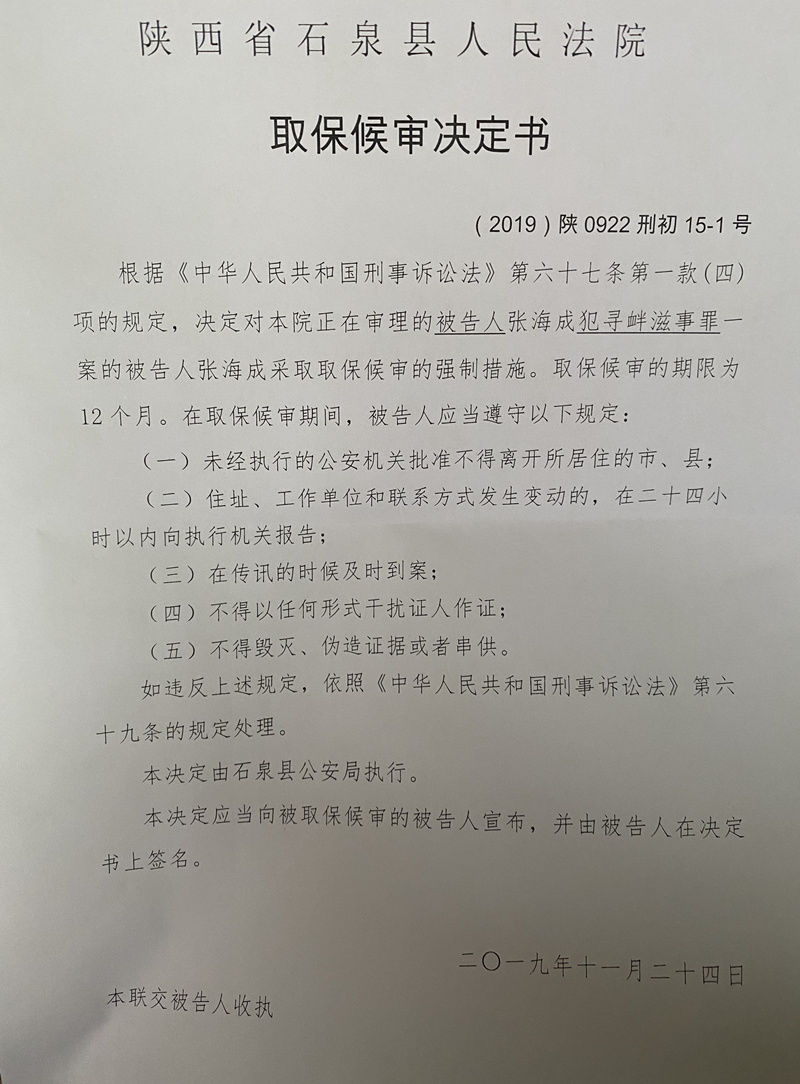 张海成的取保候审决定书。 受访者供图
