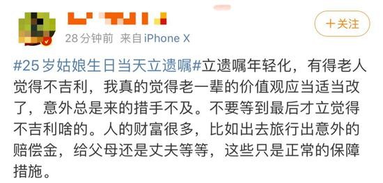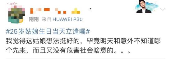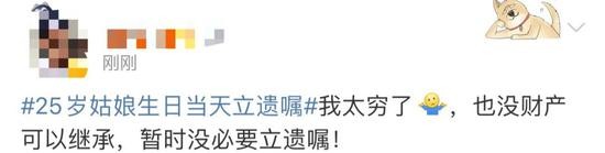在#25岁姑娘生日当天立遗嘱#登上热搜后,网友们纷纷参与讨论,有人认为,年轻人立遗嘱太早,“没有意义”,也有人觉得这么做不吉利。