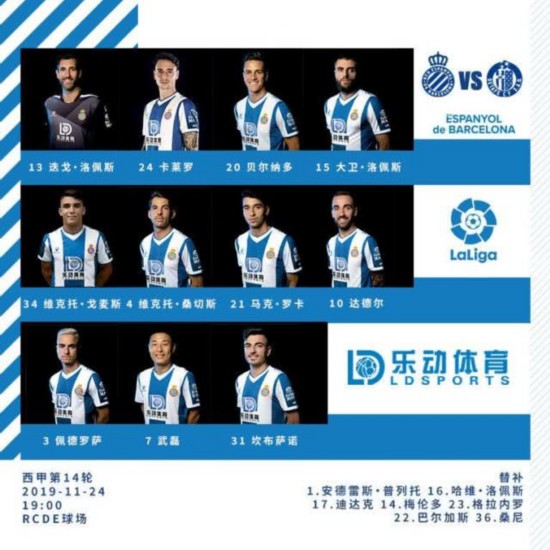腾讯体育讯 北京时间11月24日晚19时,2019-2020赛季西甲第14轮,西班牙人坐镇主场迎战赫塔菲,双方首发阵容已经公布,中国球员武磊先发出场。