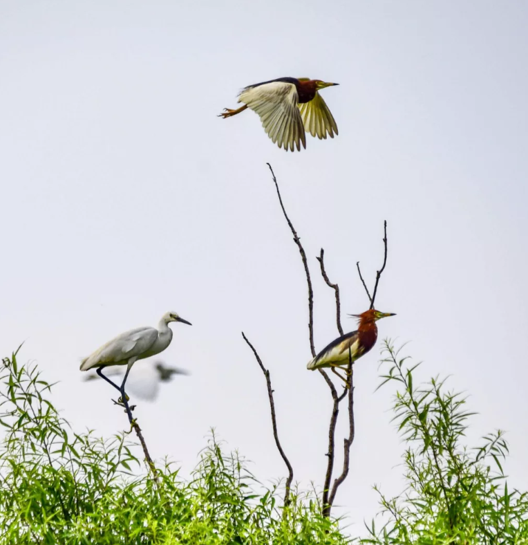 这里的鹭鸟约有万余只,以灰鹭、夜鹭等为主,白鹭较少,极目眺望,树梢上的鹭鸟,时而站立枝头,时而振翅飞翔,时而盘旋上空,让人情不自禁的举起相机,想要拍下鹭鸟的千姿百态,定格精彩瞬间。