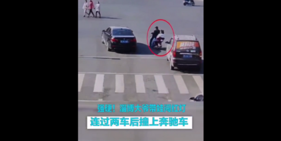 近日,山东淄博一路口,一男子骑电动车带着孩子,闯红灯过路口。