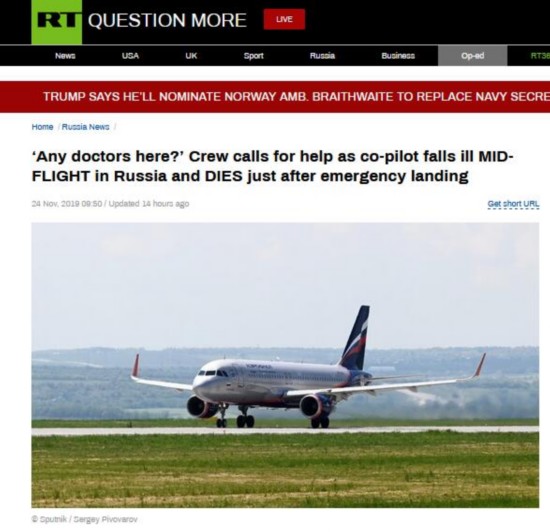 [环球网报道 记者 温家越]当地时间24日,俄罗斯一架客机的一名副驾驶在飞行途中出现严重的健康问题。飞机紧急降落后后不久,该飞行员身亡。