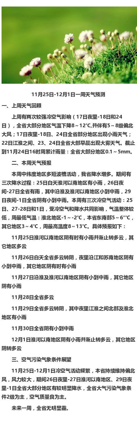 本周有三次冷空气活动:25日、27-28日和1日,受冷空气和降水共同影响,气温整体较低,周最低气温:淮北地区-1~-2℃,本省东南部5~6°℃,其它地区3~4℃,周最高温度8~13℃。