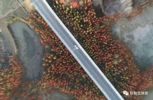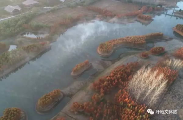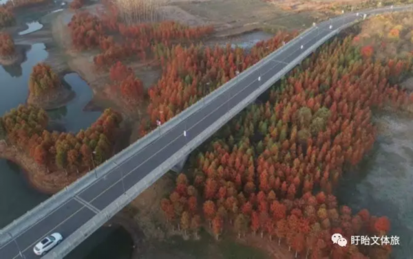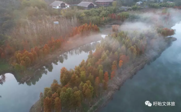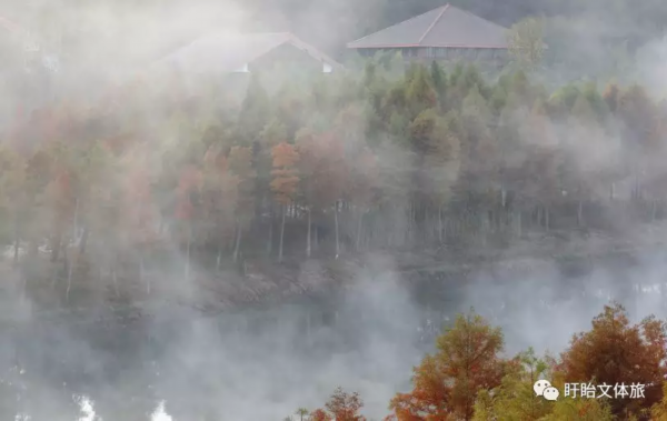 冬时节,天泉湖内的红杉林枝叶飘红,在碧水和薄雾的映衬下,美如画卷。众多色彩鲜艳的红杉挺拔于天泉湖中,形成了独特的冬日风景。