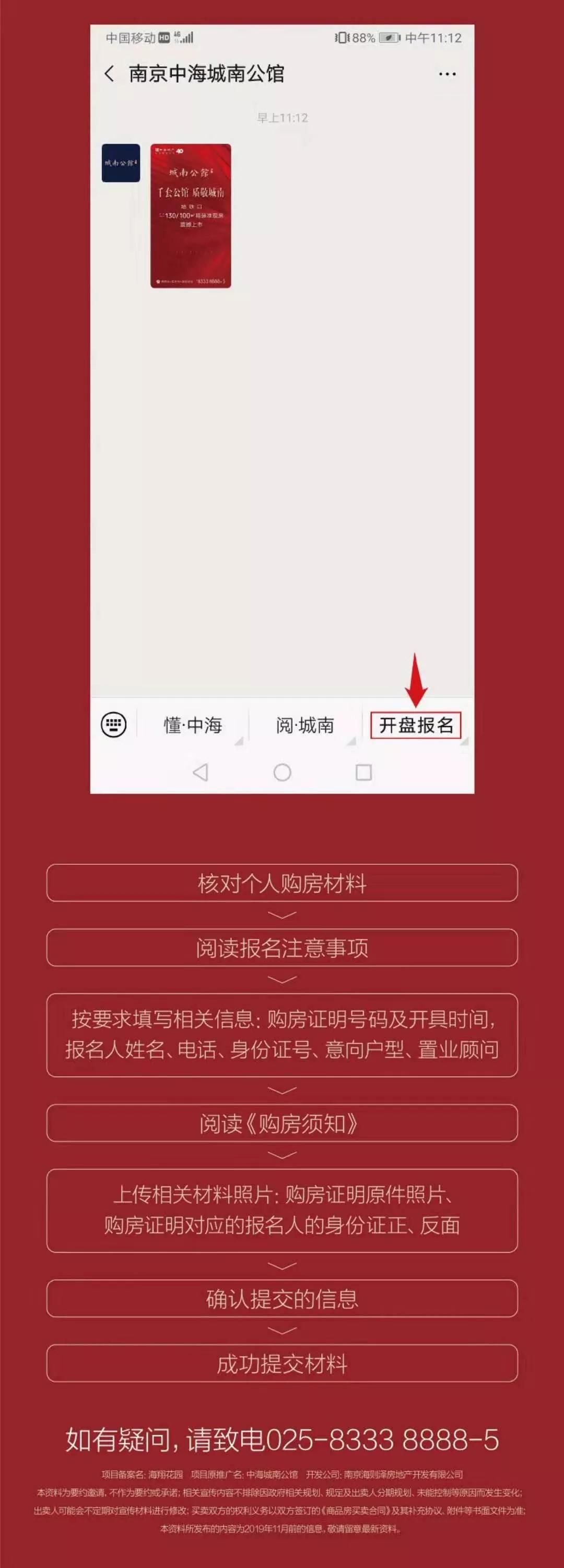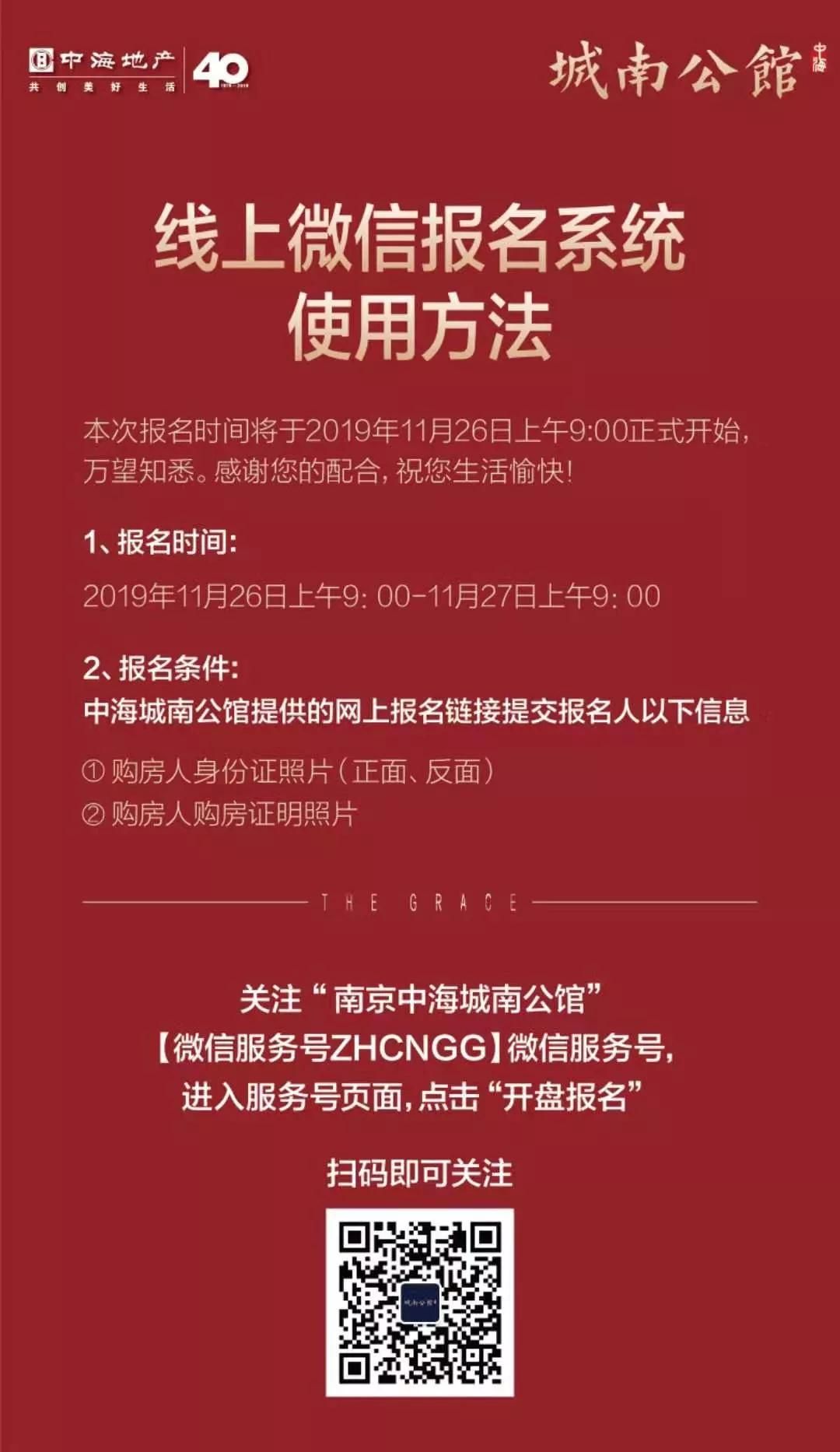 本次采用微信服务号报名形式,请关注项目官微“南京中海城南公馆”(微信公众号:ZHCNGG),点击“开盘报名”进行开盘报名,相关登记信息将作为后期摇号及选房的必要条件与依据。