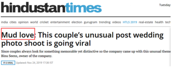 什么样的婚纱照算特别?这两天,一对印度新婚夫妇因在泥地拍摄婚纱照走红网络,不少印度媒体还在报道中提到说,这是特别的 “泥浆之爱”。