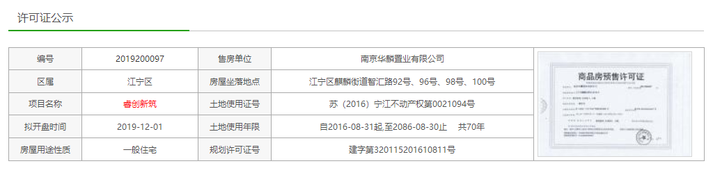 江宁区麒麟新城:蓝光睿创新筑(原蓝光黑钻公馆)11.26新领C地块1、5号楼销许,共246套毛坯房源,户型建筑面积约100㎡、111㎡、129㎡,预计2021年交付。报名时间:11月27日上午9点-11月28日上午9点;线下报名:直接前往蓝光睿创新筑售楼处报名。报名材料:①购房人身份证照片(正、反面)②购房人购房证明照片。