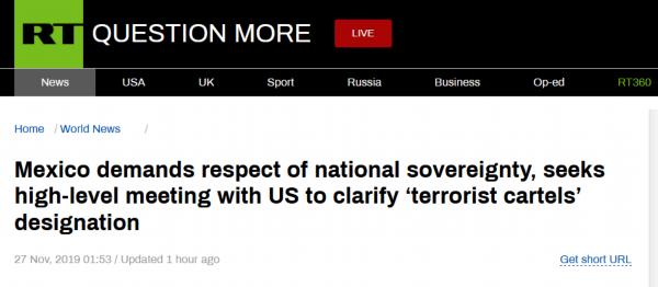 RT报道称,当地时间26日,针对美国总统特朗普表示要将墨西哥贩毒集团列为“恐怖组织”的表态,墨西哥外交部予以回应。