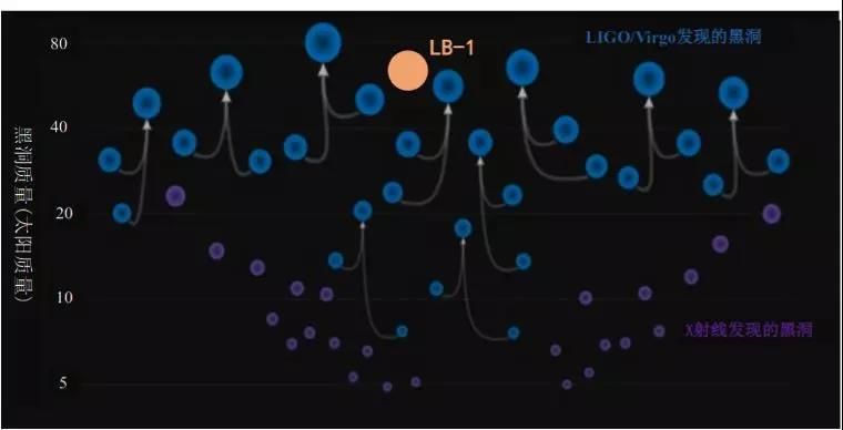 图四 LB-1和引力波并合事件、X射线方法发现的黑洞的质量分布