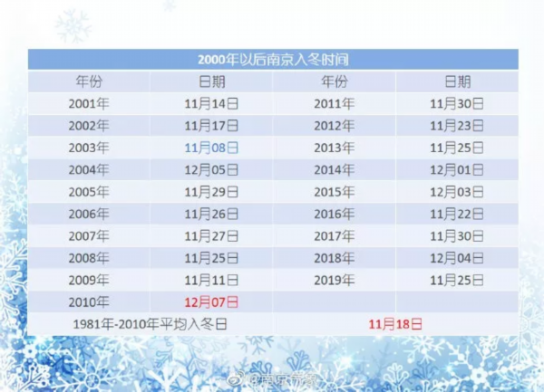 南京常年入冬平均日期为11月18日,本世纪最早入冬时间为2003年11月8日,最晚入冬时间也不过是2010年的12月7日,看来今年入冬有点略晚,但是还不算太晚~