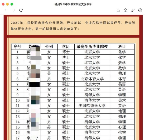 11月28日,杭州一中学通过官方微信号,公示2020年第一轮教师招聘录用人员公示名单,其中33人毕业于清华北大。 学校官微截图