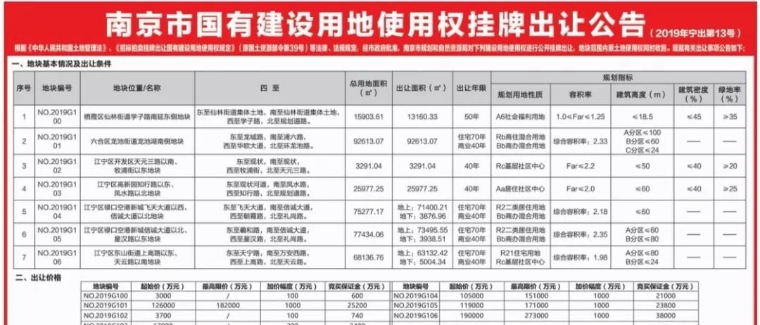 2019年收官地块来啦!继昨日江北新区推出5幅地块后,今天(11月29日),据现代快报消息,南京市规划和自然资源局发布2019年宁出第13号出让公告,共公告7幅地块,江宁再次爆发,出让地块达5幅,此外还包括仙林(1幅)、六合(1幅)。其中:住宅用地共4幅,社区中心用地2幅,社会福利用地1幅。