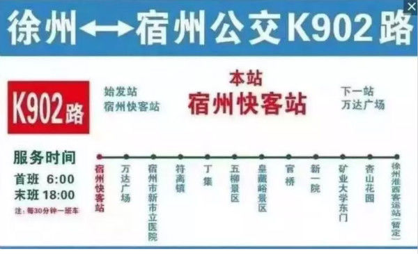 城际公交班线(K902)——宿州至徐州线路,正式运行。该线路全程82公里,从宿州快客站始发,终点是徐州淮西客运站,每半小时一班。