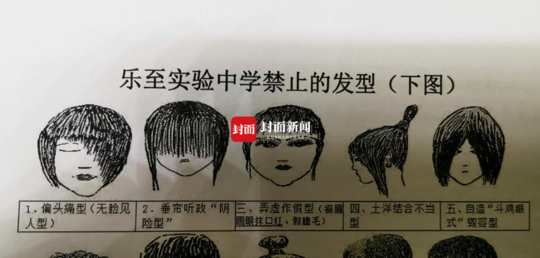 11月29日,封面新闻记者看到,乐至实验中学禁止的发型共列举了15种,其中13种配以漫画。有网友见到该校发布的禁止发型后,评论称“笑哭了”。