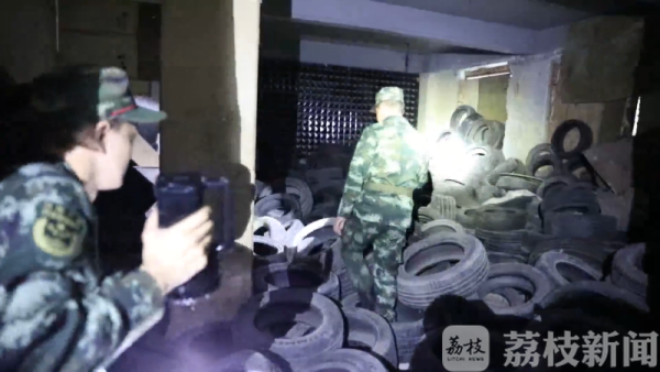 在靠内侧的房间里面,大概放有三百个废旧的汽车轮胎。轮胎摆得非常凌乱,把整个地面全部覆盖住了。