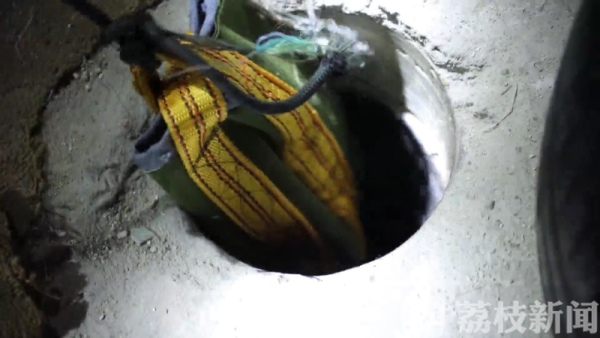 通过手电的照射,可以看到,地道内部是比较光滑的,里面深不见底。武警抓获的嫌疑物品是有胶带膜来保护的,货物是通过这根绳子,捆绑着一串一串的物品向外输送,初步估计这个洞口的另一头应该是在香港。