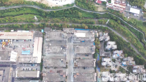 这是一片待拆迁的工业区,里面有两排整齐的高楼,门窗破旧待拆。通过航拍画面可以看到,整个园区紧挨着边界铁丝网,铁丝网边上就是香港与深圳的界河——深圳河,园区到香港区域直线距离只有500米左右。