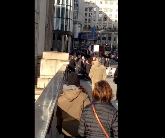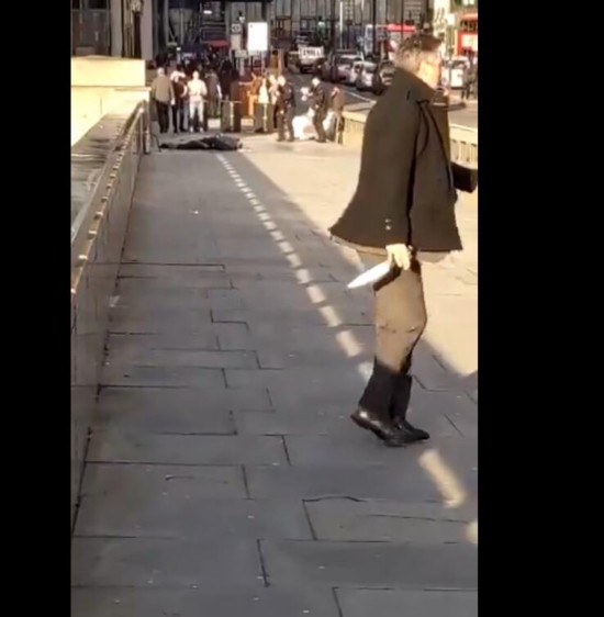 根据现场视频,一名男子持刀在伦敦桥上袭击路人,多名现场群众试图从嫌疑人手中夺下行凶刀具,警方赶到后向嫌疑人开枪并将其逮捕。