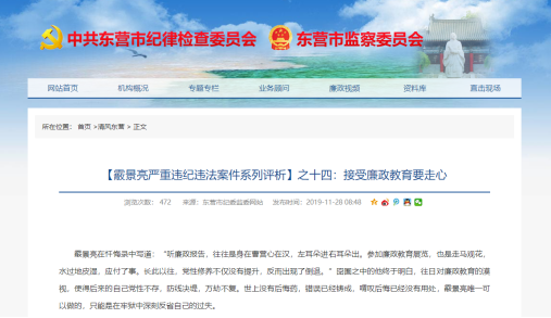 2019年11月13日至28日,山东省东营市纪委监委网站发布14篇系列文章,深度评析东营市投资促进局原党组书记、局长霰景亮严重违纪违法案件。其大量违纪违法细节被披露。