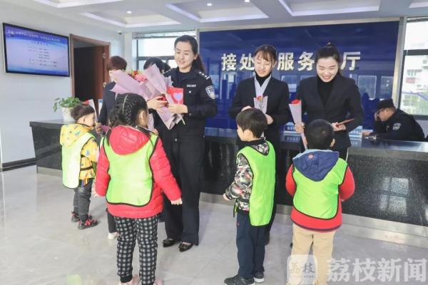 小朋友们带着自己做的贺卡和鲜花,在这个特殊的日子里,将贺卡和鲜花亲手交给这些叔叔和阿姨们,表达自己小小的感恩之心。派出所的民、辅警们纷纷接过小朋友送给他们的感恩卡和鲜花,虽然是一张张小小的卡片,但心里却是无比的温暖,这也为今后的工作带来了动力。随后,小朋友们现场为民警带来了歌曲舞蹈表演,表达对他们的感谢。