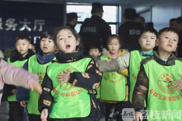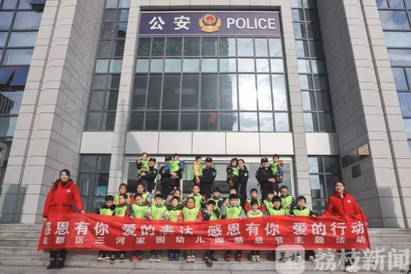 我苏网讯 “感谢警察叔叔,你们辛苦了!”11月28日是感恩节,上午,盐渎街道三河家园幼儿园的二十几名小朋友一大早就整装待发,在老师的带领下,来到了盐都区公安局盐渎派出所,给民警们送来了锦旗。园长表示,三河家园幼儿园周围治安得到了盐渎派出所有力维护,每天孩子入园、离园时以及园所重大活动时,经常看到警察维护秩序的身影,帮助幼儿园排除一切安全隐患,防止突发事件。