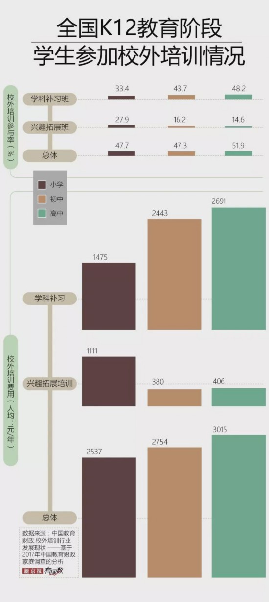 根据2017年中国教育财政家庭调查数据,在学期中,中国的中小学生校外培训平均时长为5.9小时/周,暑假期间学生每周花在校外培训上的时间则平均长达15.0小时/周。