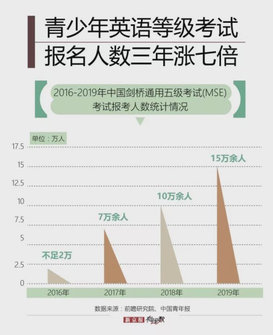 而在今年的剑桥通用英语五级证书考试网上报名时,家长们则愣是把该报名网站挤瘫痪,北京、上海等一线城市的考位几分钟内就被一抢而空。
