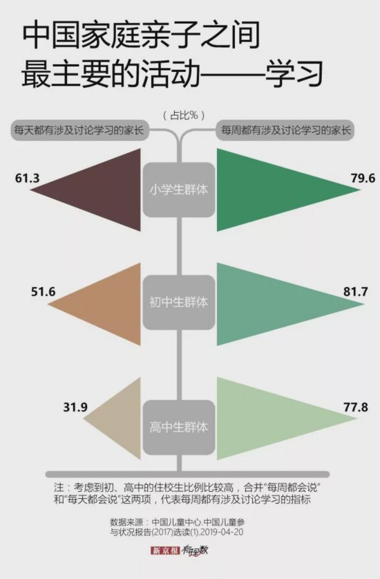 中国儿童中心主编的《中国儿童参与状况报告(2017)》,通过对全国7城市8847名中小学生的调查发现,中国家庭亲子之间最经常沟通的内容是“学习”,90%以上的父母都和儿童谈论过学习问题。