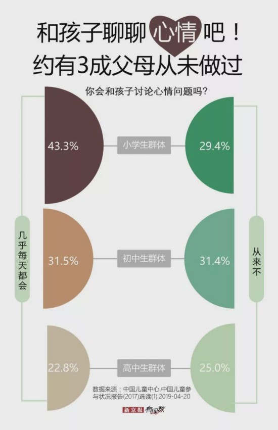而孩子心理方面的负担则隐蔽得多,却很少有家长关心到。《中国儿童参与状况报告(2017)》的调查数据显示,有约三分之一的父母从来不和儿童讨论心情问题。