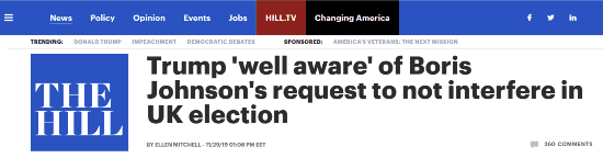 29日,约翰逊在伦敦广播公司(LBC)的一次访谈上表示,希望特朗普在伦敦参加北约峰会期间,不要对英国即将到来的大选进行干涉。美国《国会山报》说,一名美国政府高级官员当天对此回应称,“他(特朗普)很清楚这一点……(虽然)他本人也喜欢约翰逊,但他很清楚,自己不会插手别国的(选举)。”