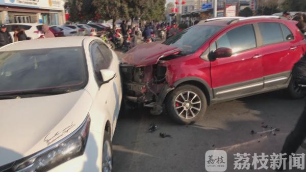 当天早上8点多,一辆红色轿车沿辅路驶入中山北路主路时,由于驾驶员疏于观察,导致其车辆与一辆正常行驶的面包车相撞,红色轿车被撞180度甩头后又撞上了路边停放的一辆轿车。