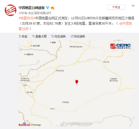 #地震快讯#中国地震台网正式测定:12月01日10时05分在新疆阿克苏地区沙雅县(北纬39.67度,东经82.78度)发生3.8级地震,震源深度30千米。
