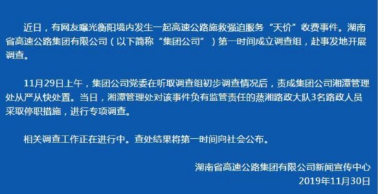 荔枝新闻讯 据湖南高速公路官微消息,近日,有网友曝光衡阳境内发生一起高速公路施救、收取“天价”费用事件。目前,经过调查,3名路政人员已被停职。