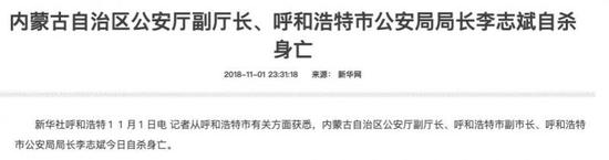 2018年11月1日,内蒙古自治区公安厅副厅长、呼和浩特市副市长、呼和浩特市公安局局长李志斌自杀身亡。