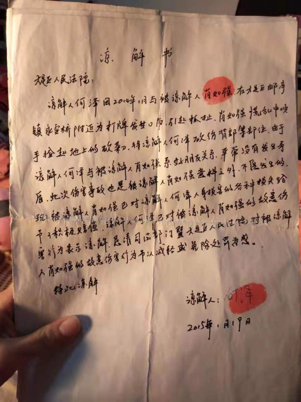 何泽所写《谅解书》。受访者供图