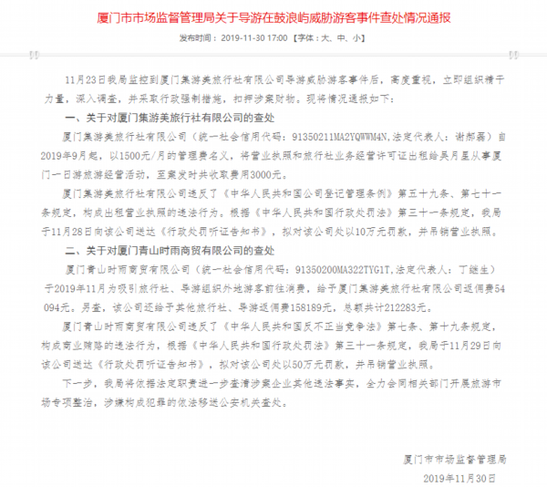 荔枝新闻讯 据厦门市市场监督管理局网站消息,近日,有媒体报道厦门市鼓浪屿有导游威胁乘客一事引发关注。11月30日,厦门市监局对此事处理结果进行通报:其中一家涉事公司因违反了《中华人民共和国反不正当竞争法》第七条、第十九条规定,构成商业贿赂的违法行为,根据《中华人民共和国行政处罚法》第三十一条规定,厦门市监局于11月29日向该公司送达《行政处罚听证告知书》,拟对该公司处以50万元罚款,并吊销营业执照。