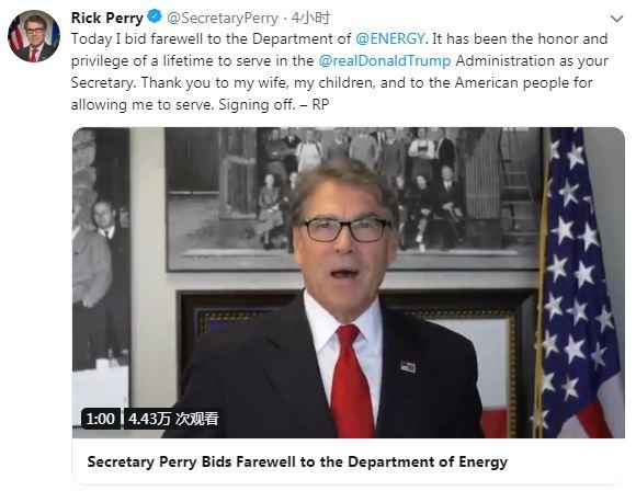 当地时间12月1日,美国能源部长佩里结束最后一天的工作,并在社交媒体上发文。图片来源:社交媒体截图。