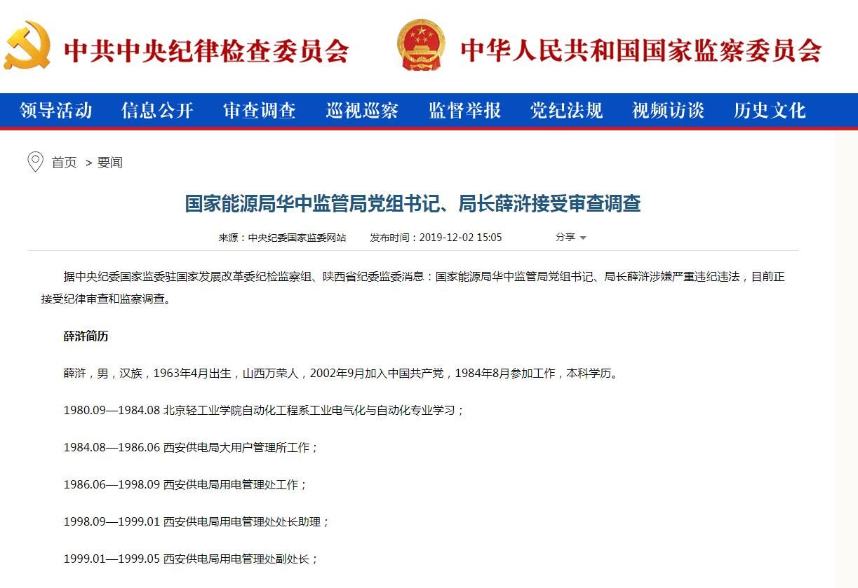 荔枝新闻讯 据中央纪委国家监委驻国家发展改革委纪检监察组、陕西省纪委监委消息:国家能源局华中监管局党组书记、局长薛浒涉嫌严重违纪违法,目前正接受纪律审查和监察调查。