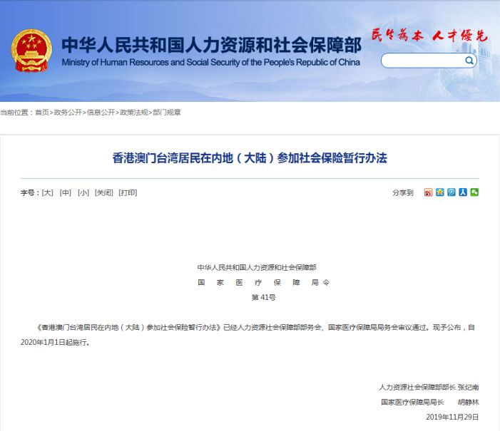 香港澳门台湾居民在内地(大陆)参加社会保险暂行办法