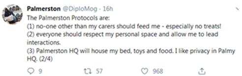 最后推文写道:“‘帕默斯顿协议’是为了确保我在外交部的福利和幸福。一个由志愿护理人员组成的专门小组经常对我的护理工作进行审查,他们将监督‘帕默斯顿协议’是否有效。老鼠们——小心!我要回来了!”