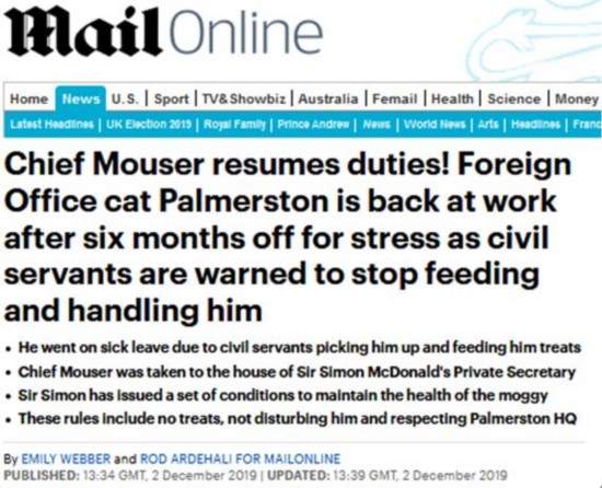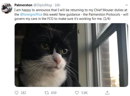 当地时间2日,为帕默斯顿开设的推特宣布了其回归的消息,推文中写道:“我很高兴地宣布,本周我将回到外交部,继续我的捕鼠工作。新的指导‘帕默斯顿协议’将管理我在外交部的护理工作,以确保它对我起作用。”