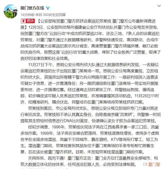 荔枝新闻讯 厦门警方在线微博12月3日消息,12月3日,公安部刑侦局向福建省公安厅刑侦总队并厦门市公安局发来贺电,祝贺厦门警方在“云剑行动”中成功抓获潜逃23年,涉及三地、7条人命的命案逃犯劳某枝,对厦门警方通过大数据精准研判,多警种快速反应、高效联动、合成作战成功抓获重大命案逃犯表示充分肯定,高度赞誉厦门警方顽强拼搏、敢打必胜的优良作风,称赞这是“云剑行动”的重大战果,得到了社会各界广泛赞誉,取得了良好的法律效果和社会效果。