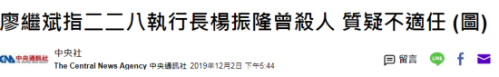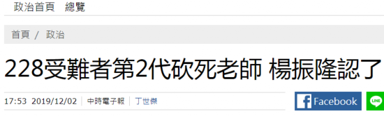 [环球网综合报道]台湾蔡英文当局又出现大丑闻!据台媒报道,现任“二二八纪念馆”馆长、“二二八事件基金会”首席执行官杨振隆被人爆料曾在高中时期用斧头砍死老师。杨振隆本人也承认自己曾犯下杀人罪行。蔡当局任用杀人凶手担任“部长级”要职的这一行为,被批是“凶残的象征”。